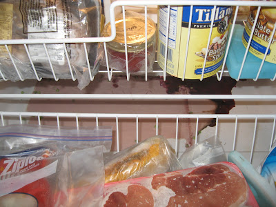 This is the bottom of my freezer. That's some marionberry ice cream, which melted and got all over everything, then froze. If you look carefully you can see some peas in there too. It's been there for about 3 months. I can't figure out how to clean it without, you know, actually taking everything out of the freezer and cleaning it.